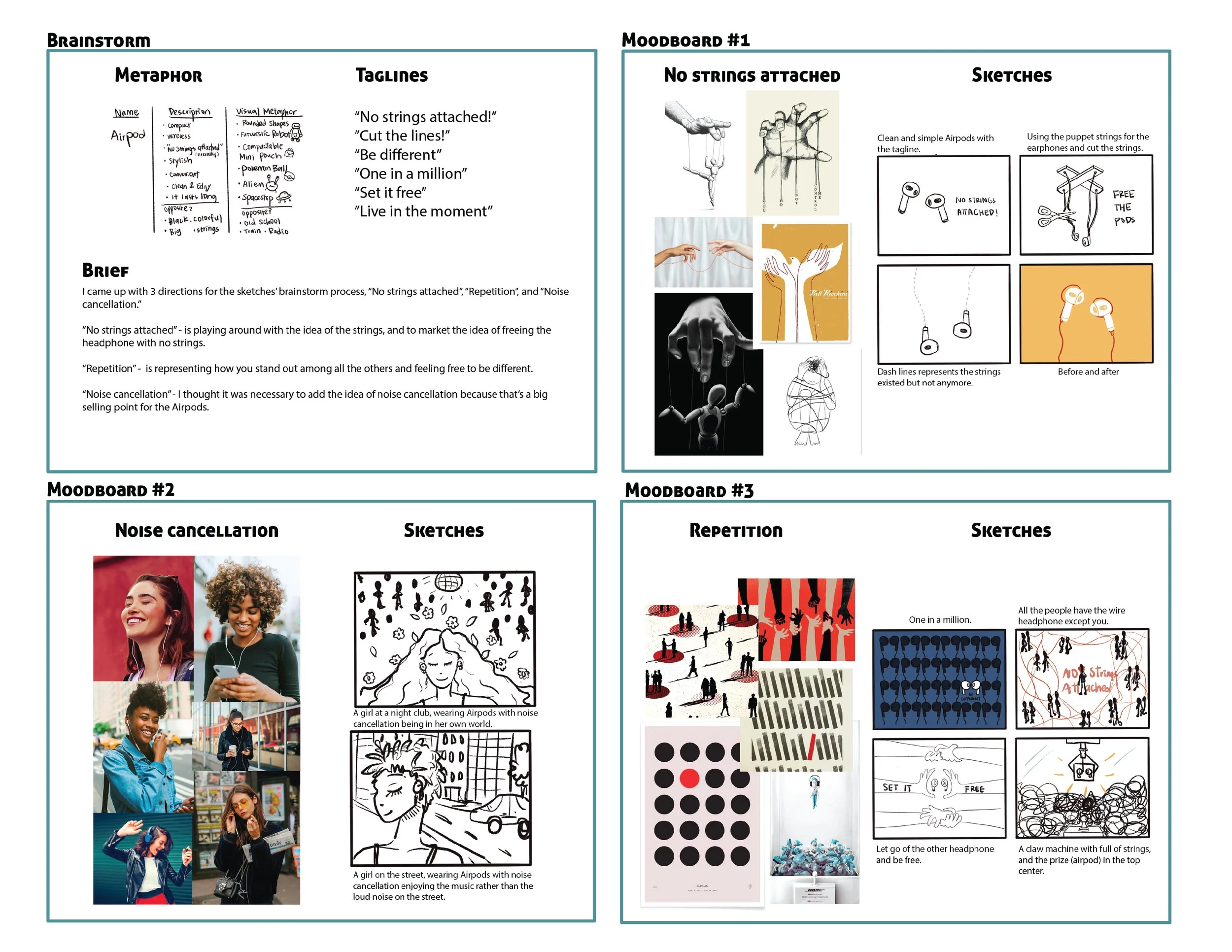 During the brainstorming process for the sketches, I came up with three directions: "No strings attached," "Repetition," and "Noise cancellation."