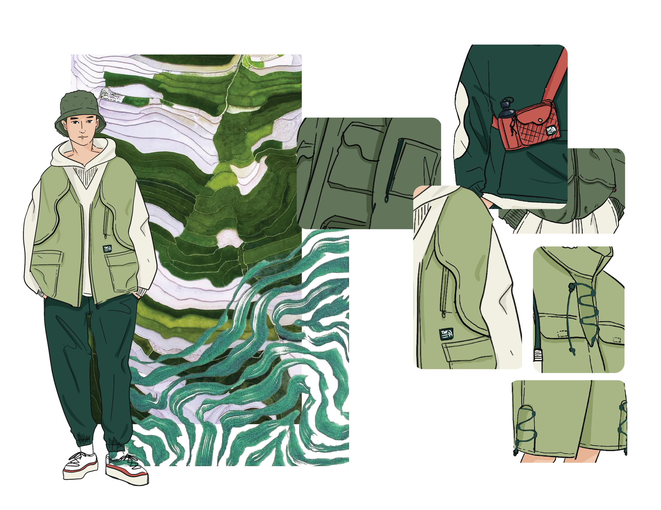 Taking inspiration from nature's contours, incorporating gentle curves, and integrating them into the silhouettes, while embracing various shades of green to convey the essence of the natural world.